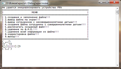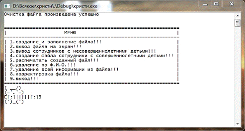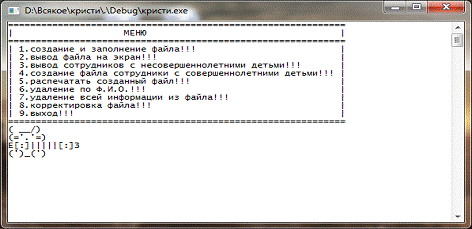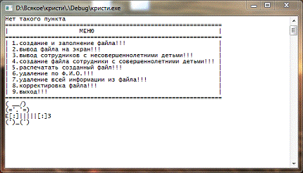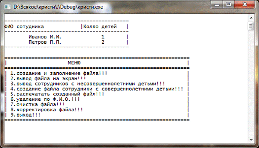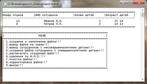 совершеннолетними детьми!!! |\n");("| 5.распечатать созданный файл!!!