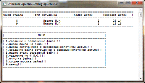 несовершеннолетними детьми!!! |\n");("| 4.создание файла сотрудники с