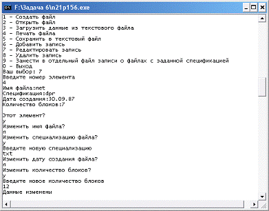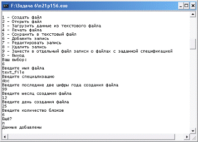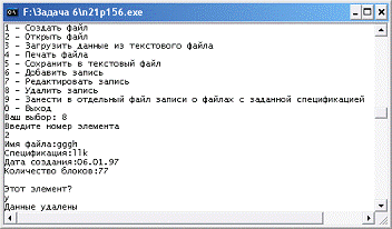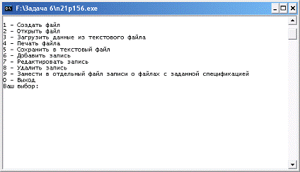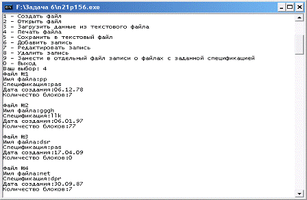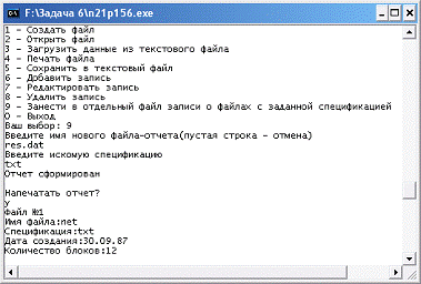 запись');('9 - Занести в файл-отчёт записи о файлах с заданной спецификацией');
