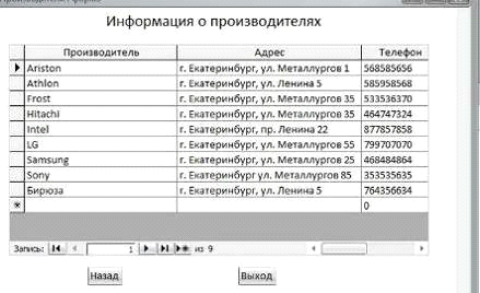 Источник данных: таблица Производитель. Подчиненная форма Информация о