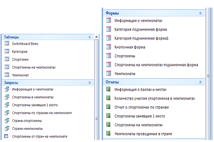 База данных, построенная на основе СУБД Microsoft Access, размещается в файле “Спорт”. В нашем случае файл