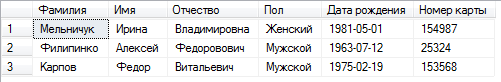 'Отчество',.Name as Пол',.DateBirth as 'Дата рождения',.AmbulanceNo as 'Номер