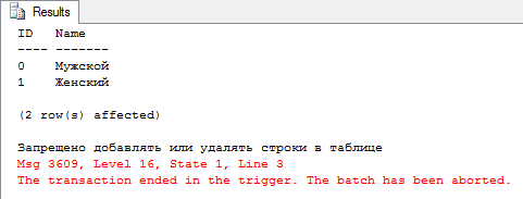 COUNT(*) from Gender) > 1'Запрещено добавление или удаление строк в таблице'