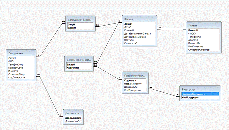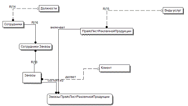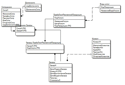UPDATE NO ACTION;TABLE T_14 ADD CONSTRAINT FK_T_1462 FOREIGN KEY (заказН) REFERENCES T_заказы (заказН) ON DELETE NO ACTION ON UPDATE NO ACTION;TABLE T_сотрудники ADD CONSTRAINT FK_T_сотрудники68 FOREIGN KEY (кодДолжности) REFERENCES T_должности (кодДолжности) ON DELETE NO ACTION ON UPDATE NO ACTION;TABLE T_прайслист ADD CONSTRAINT FK_T_прайслист73 FOREIGN KEY (кодПродукции) REFERENCES T_виды_услуг (кодПродукции) ON DELETE NO ACTION ON