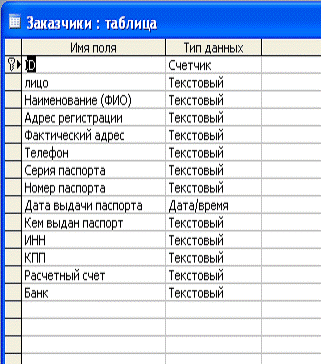 Структура таблицы «Заказчики»:
