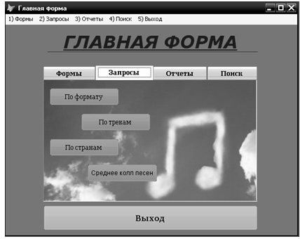 помощью внутренних визуальных средств выбранной СУБД, а информационные запросы