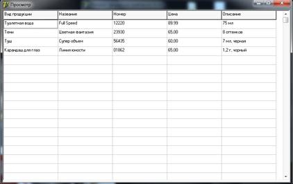 в этой программе будет храниться информация о самой продукции: ее вид,