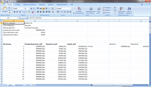 "("A3"). Value = "Метод расчета: " ("A4"). Value = "Сумма депозита,