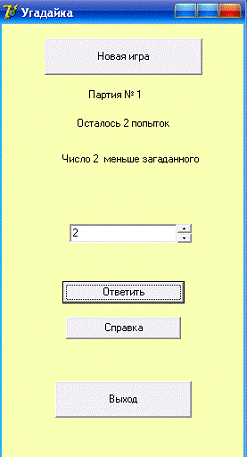 сообщением «Вы не угадали!», номер партии увеличивается на 1, число попыток