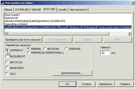 загрузки устанавливаем флажок около слова /SAFEBOOT и нажимаем кнопку OK.