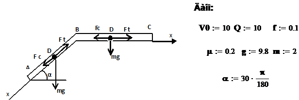 (коэффициент трения груза о трубу f ) и переменная сила F, проекция которой Fx.