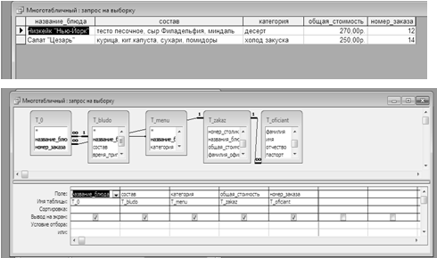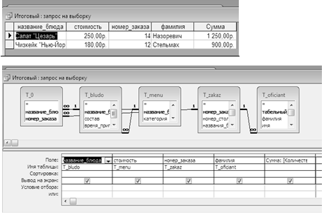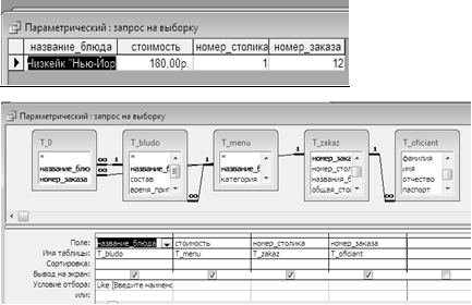 Запрос, определяющий стоимость блюда и номер заказа по названию блюда.