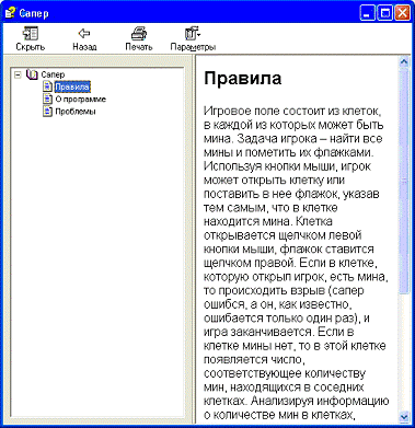 Для вывода справочной информации игра Сапер использует компонент hhopen, который физически представляет