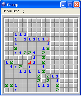 Пример окна программы в конце игры, после того как игрок открыл клетку, в