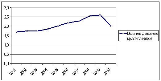 денежный мультипликатор в период с 2001 по 2010 гг. увеличился с 1,7 по 2.