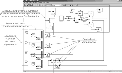модели дополнительно в системе Simulink была полная имитационная модель робота,