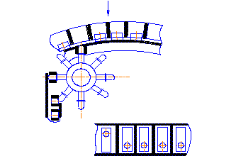 нажнем положении и получая первичную ориентацию, заготовки переносятся вверх.