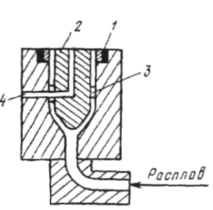 собой тетраэдр, вдоль одной из плоскостей которого вводят потоки расплавов