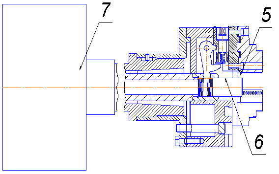 Когда деталь отсутствует, выталкиватель находится в зоне губок патрона и
