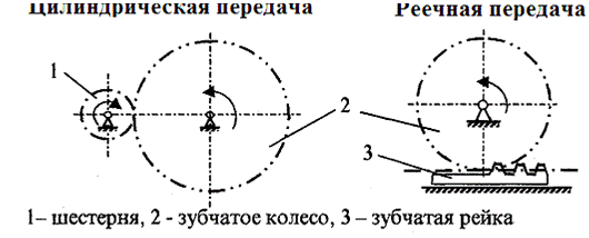 зубчатые колеса различной формы, зубчатые рейки, образующие вращательные