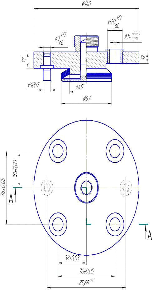 центральное сквозное гладкое ступенчатое отверстие со ступенями Ø67мм глубиной 38мм и Ø50мм. На торцевой поверхности