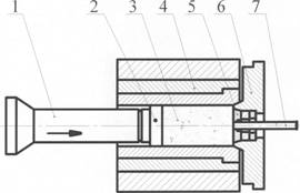 установленную в контейнере 4. Металл выдавливается через канал матрицы,