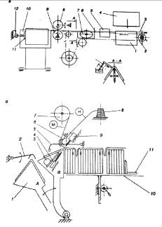 горизонтального типа, опираясь корешком на ремни транспортера 1, верхняя ветвь