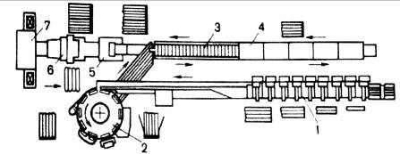 самонаклад-раскрыватель 1, транспортирующую систему 2, качающийся стол 3,