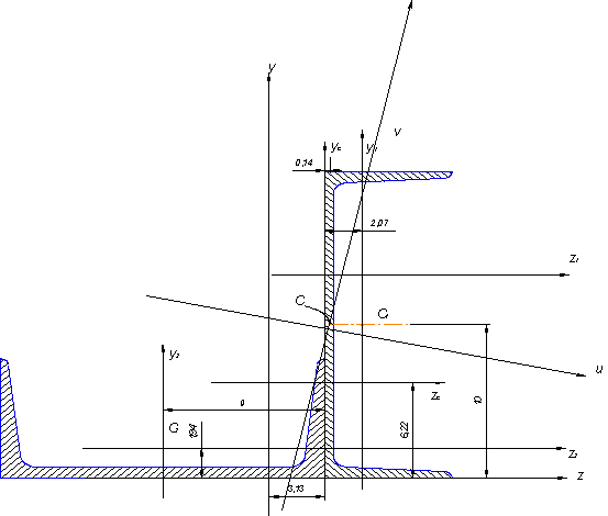 несимметричного сечения, составленного из двух прокатных профилей, определить: