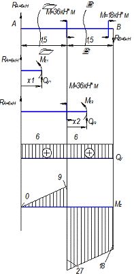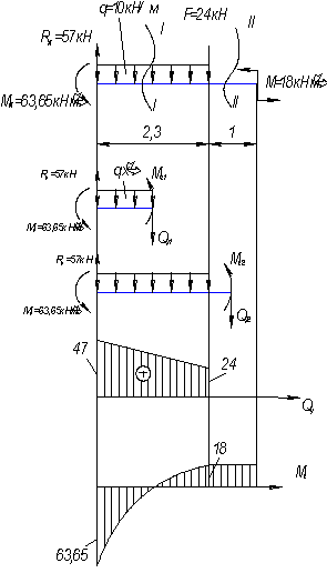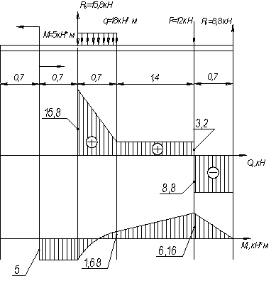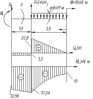 эпюры поперечной силы и изгибающего момента.