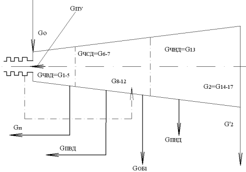 Распределение потоков пара по ступеням турбины показаны на рис.1.2.