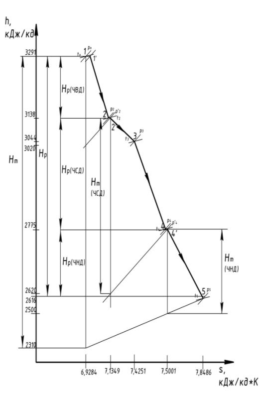 - использованный теплоперепад в ЧВД, ЧСД и ЧНД