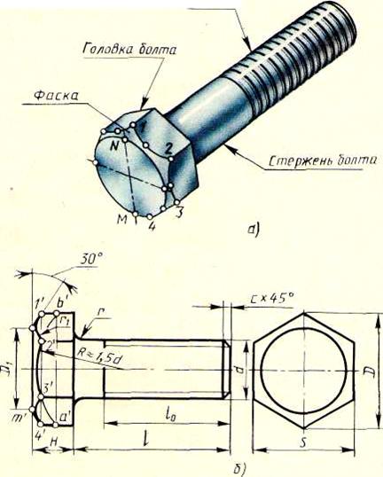 стержней болта, шпильки или винта; фаски на крепежных деталях не изображают. Не