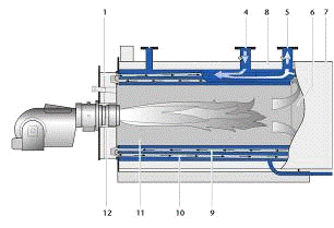 используется принцип трехходового прохождения продуктов сгорания (№11, 9, 10 на