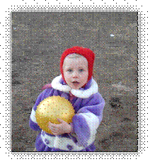 держит ее мяч. Он что-то говорит девочке, берет ее за руку.