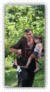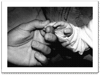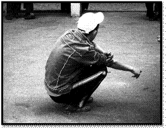 рука. Девочка стоит рядом с сидящим на корточках незнакомым мужчиной, который