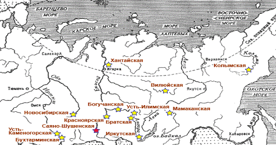 Карта гидроэлектростанций Сибири