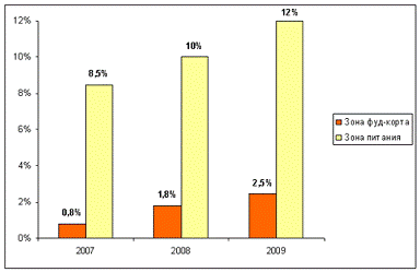 средняя доля фуд-корта и в целом зоны питания в крупнейших торговых комплексах