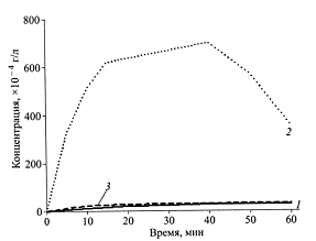 г/л), достигает максимума уже через 20 мин (47,5 • 10-4 г/л) и далее