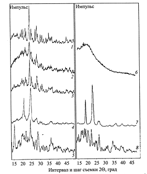 интенсивность пиков кристаллического вещества существенно ниже, чем на