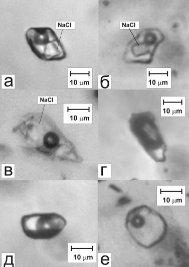 многофазовые включения рассолов, 2 - газовые включения, 3 - двухфазовые