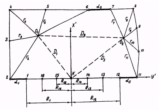 10,…,16, прокладывают полигонометрический разомкнутый ход 8-9-10-…-16-17 с