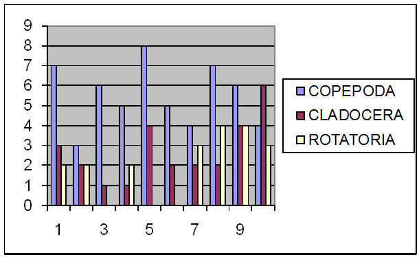 Из рисунка мы видим, что преобладающей группой является Copepoda. Она встречалась на каждой станции. Cladocera распространена более равномерно по