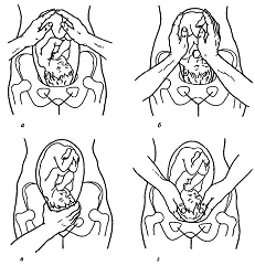 Первые срочные роды в головном предлежании, продольное положение, I позиция, передний вид