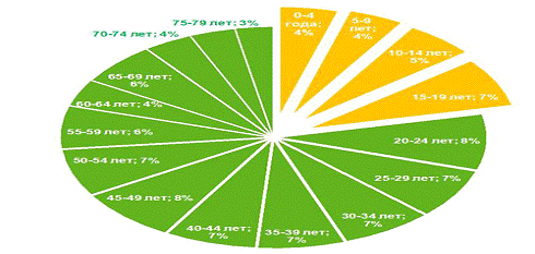 юные 0-19 лет 20%. Причем число пожилых людей составляет около 15% что по шкале