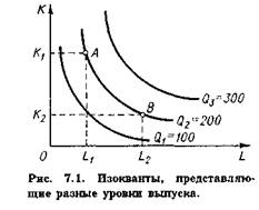 7.1 приведены три изокванты, соответствующие выпуску 100, 200 и 300 единиц