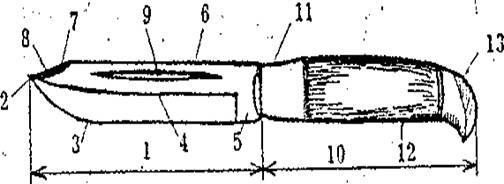 обуха; 9 - дола (выточка); 10 - рукоятка; 11 - кольцо; 12 - ручка; 13 -