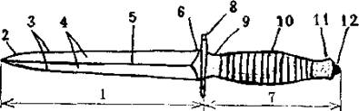 -клинок; 2 - боевой конец; 3 - лезвие; 4 - дола; 5 -
