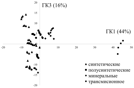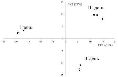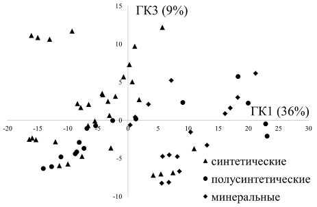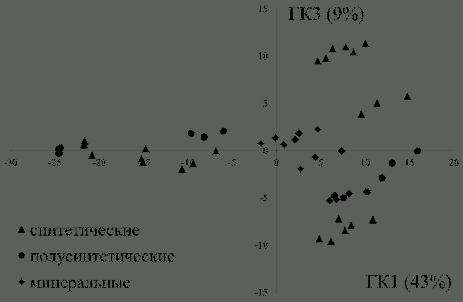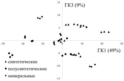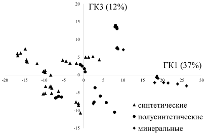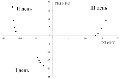 Рис. 4.2. График счетов ГК1-ГК3 МГК-моделирования вольтамперограмм