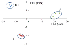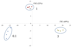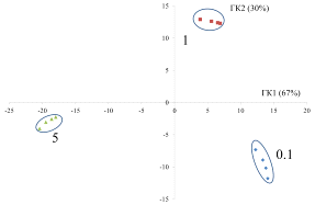 Рис. 4.5. График счетов ГК1-ГК2 МГК-моделирования вольтамперограмм